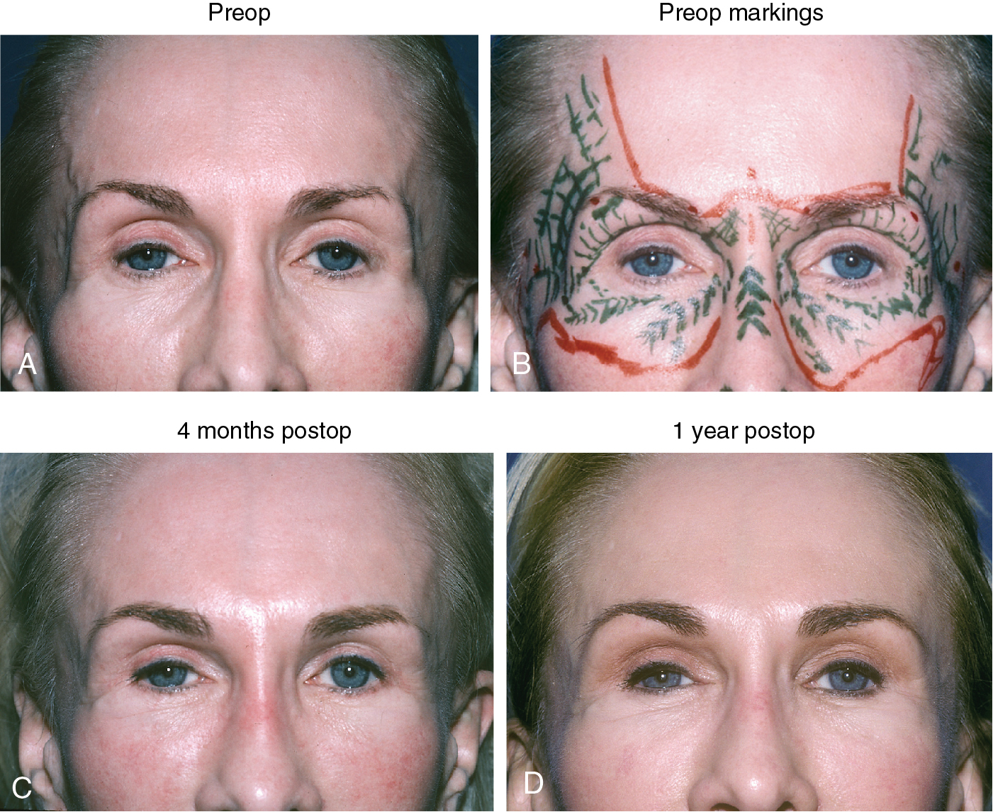 A 50-year-old woman presented with hollowing of the temples with prominent veins, hollowing of the orbits, prominent tear troughs, loss of malar prominence, and loss of definition of the nasal dorsum ( Fig. 35.1 A–D). A total of 200 mL of fat was harvested from her inner, outer, and anterior thighs by using 10-mL syringes and Coleman harvesting cannulas. The fat was processed in the standard manner by using the Coleman technique described previously. The refined fat was then placed as follows: right temple, 4 mL; left temple, 3.5 mL; glabella, 1.5 mL; right upper eyelid, 2 mL; left upper eyelid, 2 mL; right lateral eyelid, 0.8 mL; left lateral eyelid, 0.8 mL; dorsum, 2 mL; right anterior malar fold, 2 mL; left anterior malar fold, 2 mL; right lateral infraorbital rim, 2 mL; left lateral infraorbital rim, 2 mL; right lateral cheek, 1 mL; and lateral cheek, 1 mL. The fat was placed by using a combination of Coleman cannulas and 22-gauge needles, but mostly with type III cannulas. Fig. 35.1 shows photographs of the patient preoperatively with and without markings of the areas to inject and at 4 months and at 1 year after fat grafting, with no other procedures in the interim. The patient obtained lasting restoration of fullness in every area of the face infiltrated, a decrease in hollowness, reduction of visibility of the temple veins, and a remarkable improvement in the quality of skin over time.