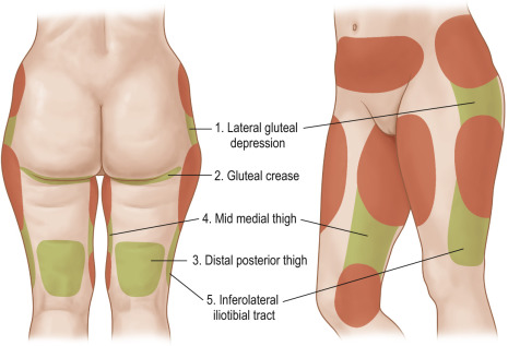 Anatomic “zones of adherence” are areas of relatively dense fibrous attachments to underlying deep fascia and help to define the natural shape and curve of the body ( Fig. 8.2 ) .