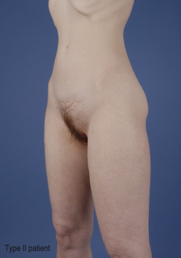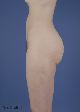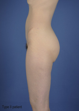 Type II: generalized lipodystrophy. Patients with lightly diminished skin tone, some skin irregularities, and circumferential lipodystrophy throughout their trunk and extremities.
