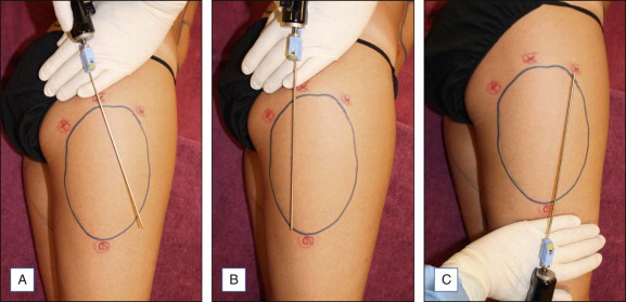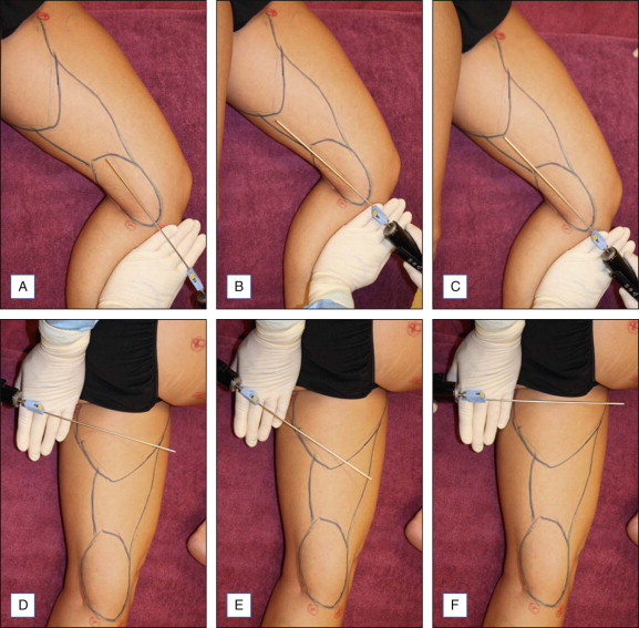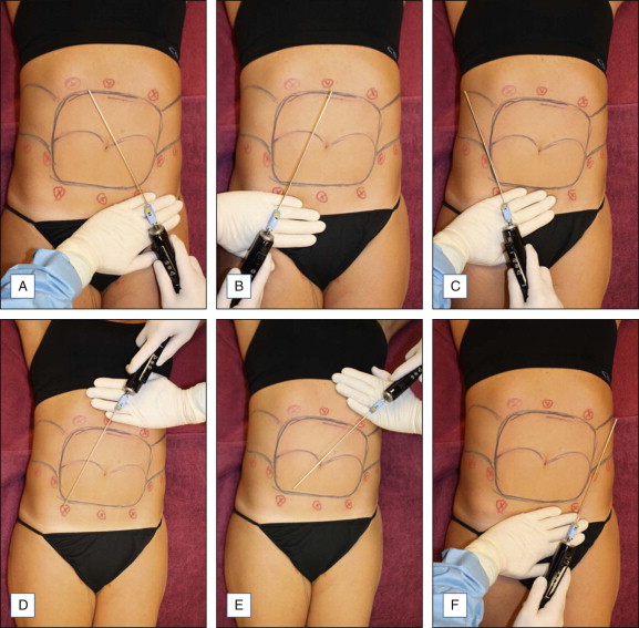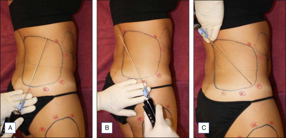 The suction cannula is inserted vertically, redirected to the horizontal plane, and then repositioned so that the cannula aperture is facing downwards, away from the overlying dermis. Tunneling with the cannula is conducted using meticulous, linear strokes, in a fan-like pattern radiating circumferentially from the incision point. Long strokes that comprise almost the entire length of the cannula should be used so that fat is removed consistently and evenly, and small areas are not oversuctioned so as to create indentations. The nondominant hand, or ‘smart hand’, may be placed on the skin overlying the cannula tip to monitor the cannula position. The use of multiple entry sites facilitates a criss-cross pattern to optimize contour. Suction should be parallel to the axis of lymphatic drainage to minimize tissue trauma. To stabilize the tissue, use of MASST, manually assisted skin stabilization technique, is helpful. In this technique, an assistant stretches the skin providing traction on the skin surface. Operating technique varies according to surgeon and anatomic region.