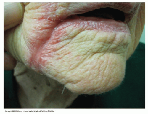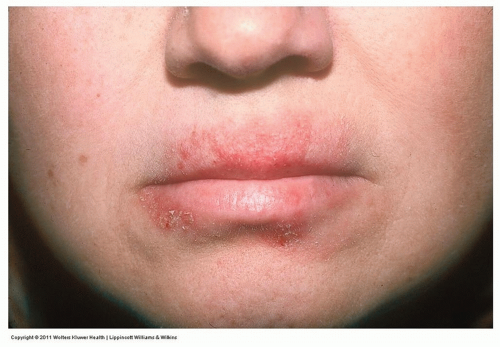 The scaling and erythema of eczema may spread on and beyond the vermillion border, which becomes less distinct and blurred (Fig. 8-1)