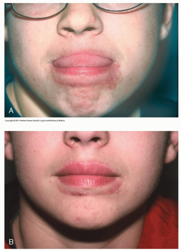 ![]() Figure 8-1 Atopic cheilitis. Note the scaling, crusting, lichenification, as well as blurring of the vermillion border in this child who has atopic dermatitis. |