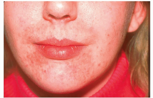Characteristically, lesions are confined symmetrically around the mouth with a clear zone of about 5 mm between the vermilion border of the lips and the affected skin (Fig. 8-5)