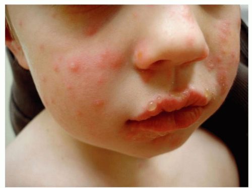 ![]() Figure 8-6 Primary herpes simplex virus. Perioral vesicles and bullae on an erythematous base are seen in this 1-year-old child. (Courtesy of Robert I. Rudolph, MD.) |