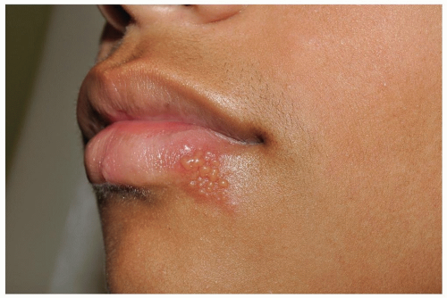![]() Figure 8-7 Recurrent herpes simplex virus. Grouped umbilicated vesicles on the vermilion border of the lower lip. |