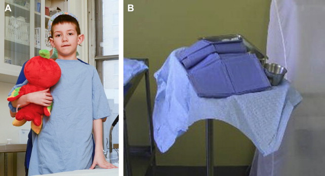 ( A ) Child walking in the operating room without his parents. ( B ) Instruments and syringe hidden.