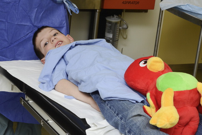 • There is no intravenous or monitoring equipment installed and the child is not restrained; he is simply asked to lie on his back with his hands hidden behind his back ( Fig. 2 ). No antibiotics are used.