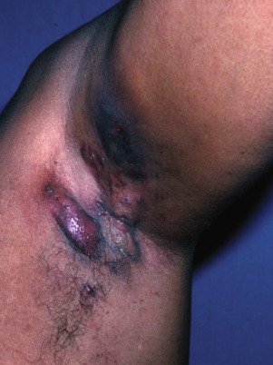 Abscesses and furuncles are rarely confused with other entities. Acne and hidradenitis suppurativa can cause pus-filled nodules and cysts. In both conditions, the distribution of the lesions usually provides the diagnostic clue. In nodular acne , multiple lesions are distributed on the face and upper trunk, and other acne lesions (e.g., comedones, papules, pustules) are usually present. In hidradenitis suppurativa , draining nodules are present in the axillary, inguinal, and perineal areas. These nodules are often accompanied by open comedones and scars ( Fig. 15.2 ).