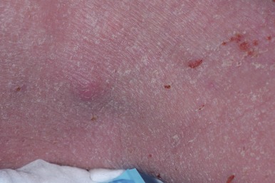 The most commonly mistaken diagnosis for an abscess is a ruptured epidermal inclusion cyst . The intense inflammatory reaction to keratin, usually contained by the cyst lining, creates a fluctuant nodule, most commonly located on the back. Lack of fever, prior history of a cyst, and the presence of a punctum on top of the cyst are distinguishing factors. Primary treatment includes incision and drainage ( Fig. 15.3 ).