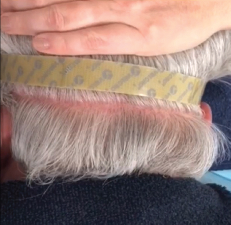 Most of the materials used for preview long hair FUE are the same as a regular FUE. The author strongly recommends the use of Velcro for keeping the hair shafts out of the surgical field. Velcro (the “hook-and-loop” type) is placed around the occipital area, the hook side facing the skin. With a thin-tail comb, you can shift the hair from under the Velcro for clearing the view of the surgical field (Fig. 72B.1).