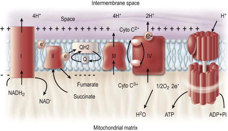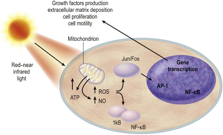 There are numerous theories and hypotheses on the mechanisms of action for LLLT. The general action spectra of LLLT was first theorized in 1989. M. Hamblin and T. Demidova indicate ‘The basic principle of this accepted theory states that the mechanism of action is based on the absorption of monochromatic visible and NIR (near infra-red) radiation by components of the cellular respiratory chain’ and the mitochondria plays a key role in this aspect. The inner mitochondrial membrane contains five complexes and the interaction between these components ends with the formation of the ATP synthase complex (carrier of cellular energy) ( Figure 13.1 ).