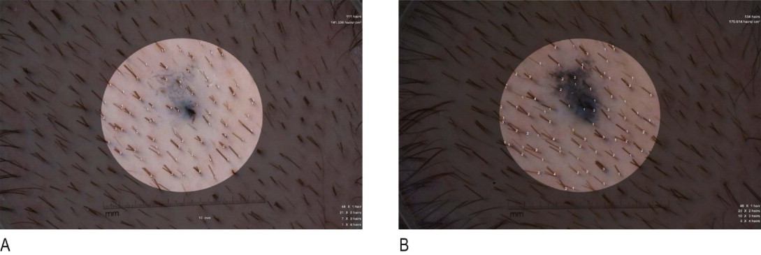 There are three recent studies about hair loss and LLLT. The first study from 2004–2005 was a 26 week, double blind, multicenter, randomized and placebo control study of 123 patients, 30–60 years old. In this study, I. Cantor and colleagues studied the effects of the HairMax LaserComb® on hair growth in males. Norwood class 2A–5 were included. HairMax Lasercomb® (3 times per week on non-consecutive days for 26 weeks) vs placebo (same period of time) was used for the study. The device was used 10–15 min each time. Global and macrophotography pictures were taken at baseline, 8, 16 and 26 weeks. The results showed that the laser group patients had a mean increase of 18.8 hairs/cm 2 vs a mean decrease of 10.6 hairs/cm 2 in patients using the placebo device. 93.9% of patients using the laser device experienced some increase in hair density. 11% of the patients of the laser group had minor adverse effects (tingling sensation in the scalp, pruritus of the scalp) vs 7.3% of the placebo group. The authors concluded that the HairMax LaserComb® was effective in the promotion of hair growth in males with androgenetic alopecia. The results also demonstrated that the LaserComb® is safe in these subjects ( Figure 13.4 ).