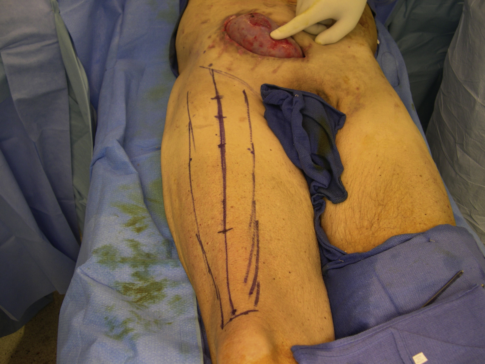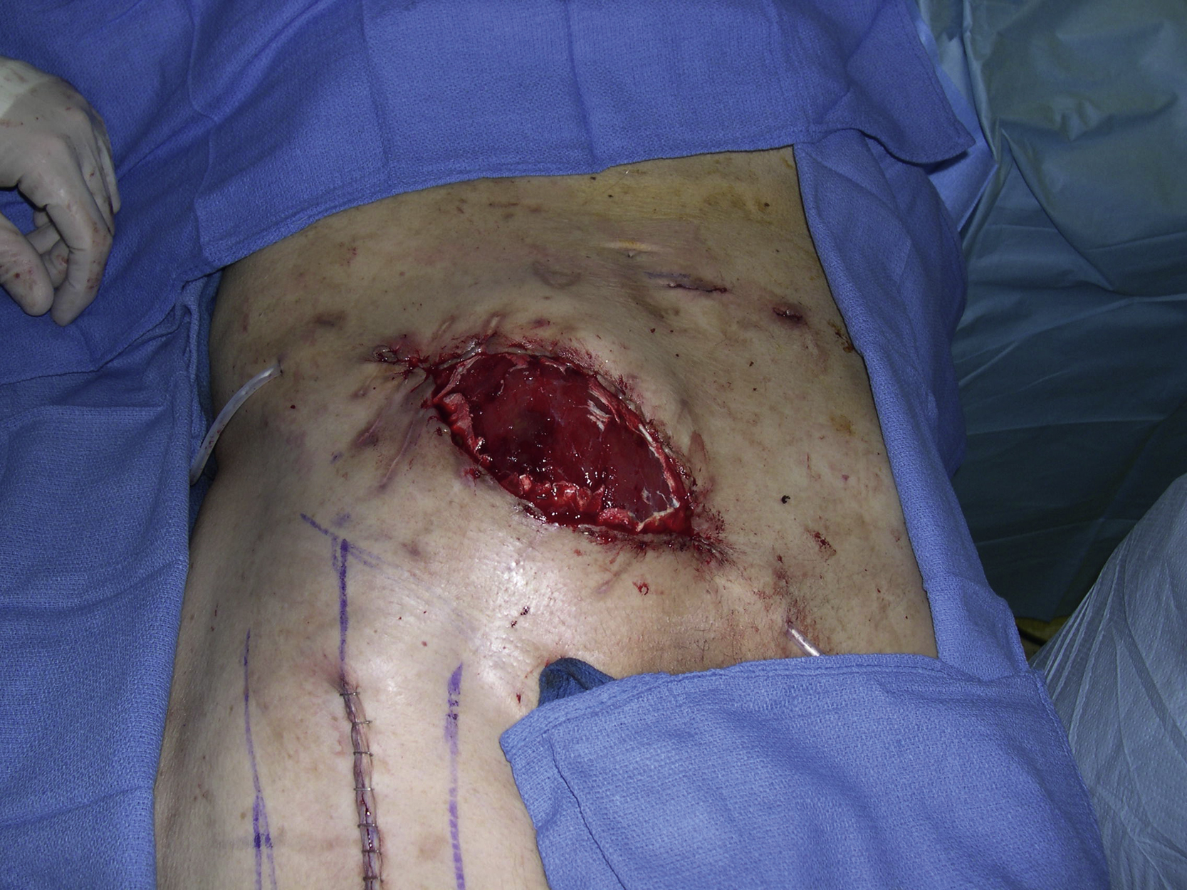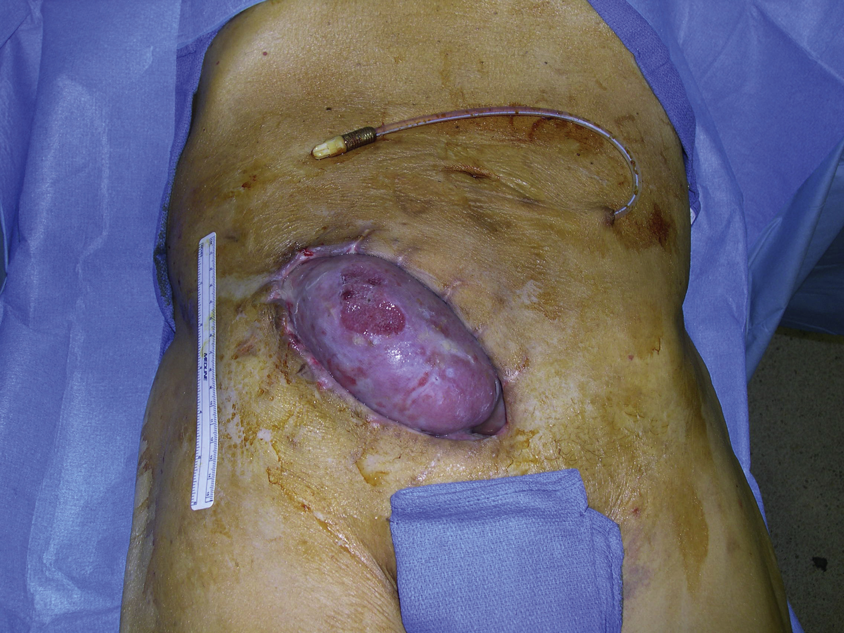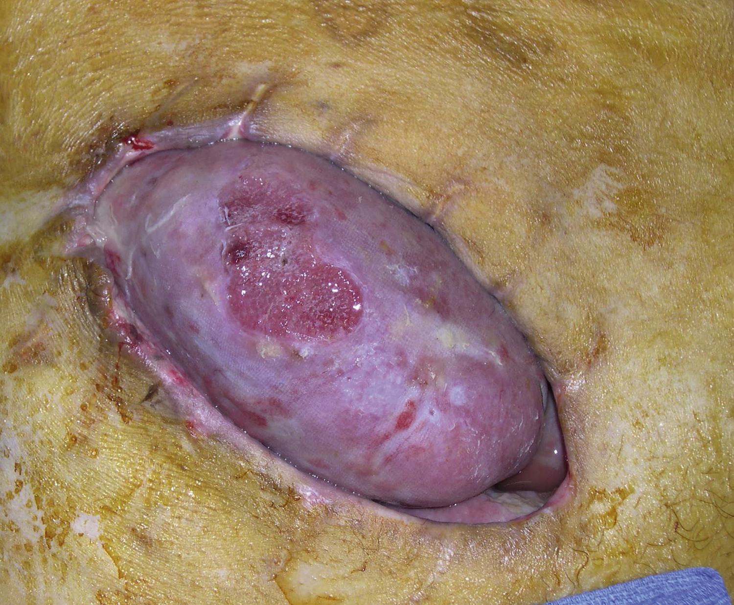 A 66-year-old White male had a renal transplantation for end-stage renal disease secondary to polycystic kidney disease by the transplant surgery service. He also had 50 pack-year of smoking history. He had chronic hypoalbuminemia caused by peritoneal dialysis. Although he underwent successful deceased-donor transplantation, he required peritoneal dialysis because his early allograft function was delayed. One week after surgery, he was found to have an enlarging perigraft hematoma. He was taken to the operating room for hematoma evacuation. Over the following days, he continued to require dialysis and developed a superficial infection of lower abdominal incision, which was opened at the bedside and packed with gauze. He was discharged home with a vacuum-assisted closure dressing and continued ongoing peritoneal dialysis. One week later, it was noted that the superior pole of the transplanted kidney was extruding from the wound and the plastic surgery service was consulted for a soft tissue reconstruction of wound closure ( Fig. 27.1 ).