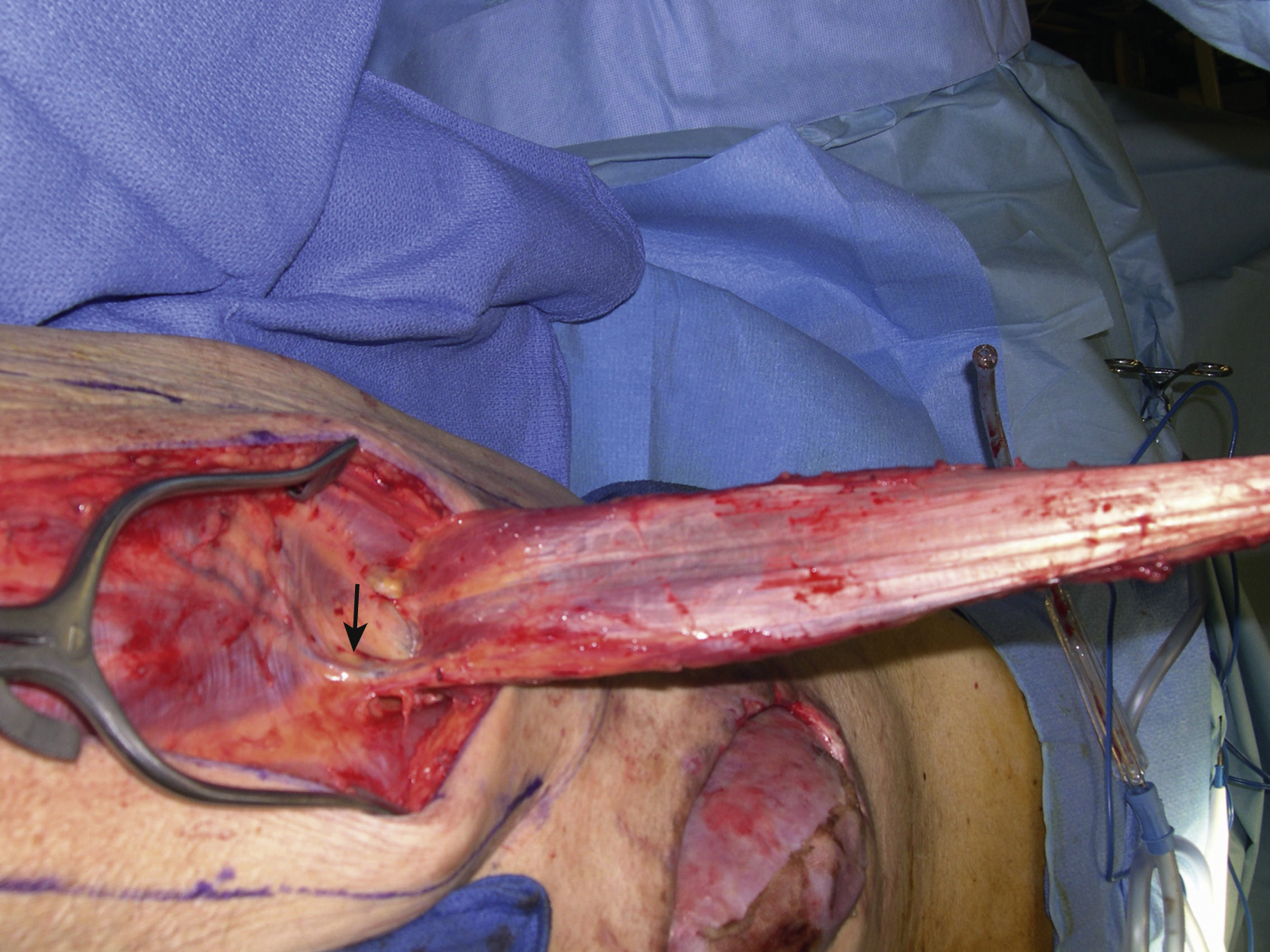 Under general anesthesia with the patient in the supine position, surgical debridement was performed to remove all necrotic, infected, or colonized tissues within the wound including the surface of the exposed transplanted kidney. The outline of the rectus femoris muscle flap and the planned incision for the flap elevation were marked in the right thigh ( Fig. 27.3 ). The rectus femoris muscle was identified first after the skin incision had been made down to the fascia. The surgical dissection could be done quickly once the vastus lateralis and medialis muscles were dissected free from the rectus femoris muscle. The distal insertion of the muscle to the patella was divided and the muscle could be quickly elevated ( Fig. 27.4 ). Once the pedicle had been identified, the proximal insertion was divided. The flap was now completely dissected free and tunneled to the right lower abdominal wound.