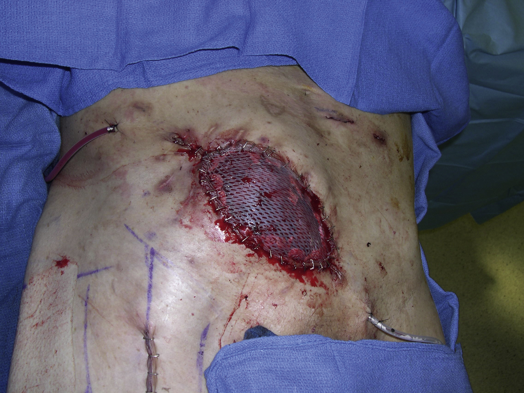 The flap was then placed onto the exposed kidney and approximated to the adjacent skin edges of the open wound with interrupted 3-0 Monocryl sutures in half-buried horizontal mattress fashion after drain placements ( Fig. 27.5 ). A split-thickness skin graft was harvested from his right thigh and meshed to 1 to 1.5 ratio. It was placed over the muscle flap and secured with skin staples ( Fig. 27.6 ). The donor site incision was closed in two layers over a drain ( Fig. 27.7 ).
