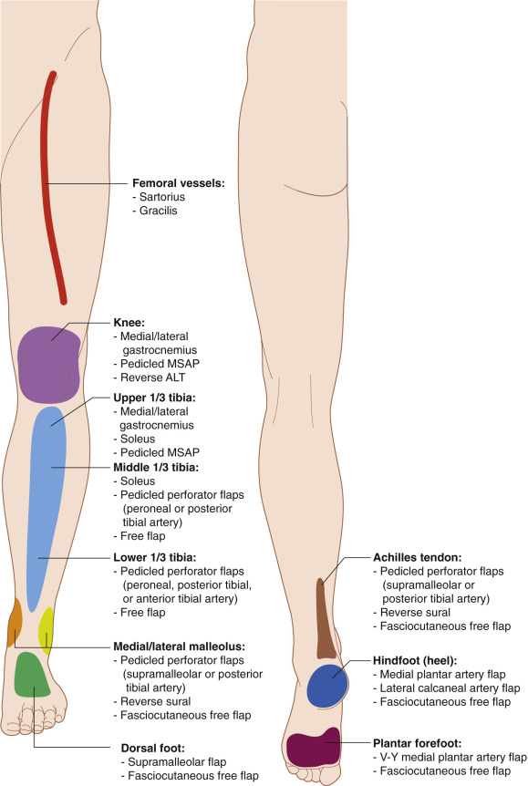 Traumatic lower extremity injury often creates a deficit of soft tissue. Soft tissue defects requiring reconstructive flaps will occur in the following areas: large vessels of the thigh, knee, tibia, Achilles tendon, medial malleolus, lateral malleolus, dorsal foot, hindfoot, and forefoot ( Fig. 22.5 ). The goals of reconstruction are to provide durable coverage of critical structures (healing bone, tendons, or vessels). Ideally, this initial reconstruction should be done in a manner that eliminates the need for future procedures whenever possible. Specifically, if an entire functional musculotendinous unit is sacrificed by the initial trauma, our group’s preference is to replace that musculotendinous unit at the initial stage of reconstruction with a functioning free muscle transplantation (FFMT). For instance, trauma that has caused irrecoverable functional loss of any one of the anterior compartments, posterior compartment, Achilles tendon, or patellar tendon in the leg may be reconstructed by an immediate single-stage composite rectus femoris FFMT with anterolateral thigh (ALT) flap skin paddle if necessary. Both flaps are based upon the lateral circumflex femoral artery system ( Fig. 22.6 ).