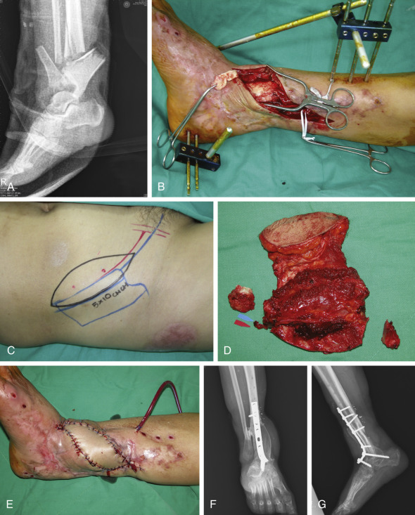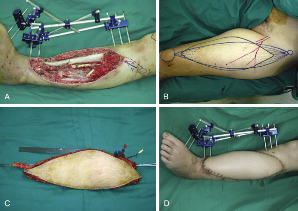 Secondary reconstructive requirements frequently arise, and thus the primary effort at soft tissue reconstruction should always be performed in a manner that facilitates possible second-stage procedures (e.g., flap re-contouring or tendon transfer). The preference of our group is to use microvascular transfer of fasciocutaneous tissue for defects around the metaphyseal regions of the knee and ankle since these flaps have been shown to be equally effective as free muscle flaps in preventing osteomyelitis and promoting bony union. Furthermore, these flaps provide soft tissue with a smooth, gliding undersurface that may be easily re-elevated because traumatic cases involving the joints will frequently require secondary procedures such as joint contracture release or tendon transfer. When there is a substantial 3-D soft tissue defect such as around diaphyseal fractures that require dead space obliteration, we use a myocutaneous flap.