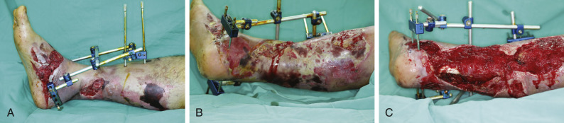After salvage has been decided upon, attention to a thorough surgical debridement is paramount. Our group’s opinion echoes many other centers in that surgical debridement is critical to the ultimate success of the reconstruction. Inadequate debridement will ultimately result in infection, which may manifest as a persistent wound, osteomyelitis, bony non-union, or flap failure. Consideration of wound debridement lends naturally to the topic of timing of reconstruction. While previous studies have designated certain timeframes and suggested the importance of adhering to time restrictions in achieving wound coverage, more recent literature has arisen to counter this argument. Our feeling is that adequate surgical debridement should dictate the time course of reconstruction. For instance, a blast injury may necessitate repeated surgical debridement to achieve a healthy and clean wound bed. While there is a general effort to minimize the time to wound coverage, the overriding objective is to continue with surgical debridement until a healthy and viable wound bed is certain ( Fig. 22.1 ). Our group agrees with the recommendations of the EAST protocol with Gram-positive and Gram-negative coverage continuing for 72 h after injury and 24 h after soft tissue coverage. In the patient population discussed in this chapter (mutilating-type injuries often with extensive contamination), we have an extremely low threshold for broadening coverage to include anaerobic flora or extending treatment to 7–10 days after flap reconstruction.
