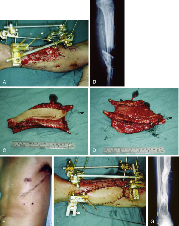 Mutilating lower extremity injuries often test the limit of orthopedic capability. Many of these injuries require either external fixation or procurement of additional vascularized bony tissue for reconstruction. Smaller bony defects up to 6 cm may be treated by conventional bone grafting at 6 weeks to minimize the risk of infection. Bony defects of the tibia and femur exceeding 6 cm in length are best treated by single-stage vascularized osseous flap transfers. Reconstructions of ≤10–12 cm may be achieved with osteomusculocutaneous flaps harvested from the fibula, rib-serratus anterior, or iliac crest-groin flap donor sites. The potential donor site morbidity with fibula harvest (great toe dysfunction, skin graft failure, ankle pain) is generally more minor that that of iliac crest or rib harvest, which may incur abdominal hernia and pneumothorax, respectively. If using the rib-serratus anterior composite flap in situations such as with bilateral tibia-fibula fractures when the fibula is unavailable, we typically harvest a pair of non-consecutive ribs to allow for a “double-barrel” design that provides better structural stability. The fibula osteocutaneous flap is the preferred technique for bone defects up to 18 cm and their associated soft tissue requirements, as it has been shown to provide the greatest amount of cortical bone and also to have the lowest rate for surgical complications such as osteomyelitis, skin paddle partial loss, stress fracture, non-union, and secondary amputation. At the upper limits of bone requirement, it is occasionally necessary to rely on a single-strut reconstruction, and our group has found these reconstructions to evolve to excellent stability and durability with the excellent potential for bony hypertrophy that is present in vascularized bone. Of note, the fibula and rib donor sites seem to have a more rapid rate of hypertrophy than the iliac crest, but all three methods achieve comparable weightbearing capacity at 2 years postoperatively ( Figs 22.2–22.4 ). Some groups advocate a staged reconstructive process in situations of substantial concomitant bony and soft tissue defect. They recommend soft tissue coverage followed by vascularized bone graft at a later stage. However, this approach prolongs both the reconstructive timeline and the period of disability for the patient. Furthermore, during the surgery for the second free flap, the surgeon will encounter a fibrotic soft tissue environment around the recipient vessels that may render them unsuitable for use. Our group has demonstrated the ability to reliably perform one-stage composite soft tissue and bone reconstruction with similar functional outcomes to the staged approach. The average time to bony union in our series of osteocutaneous reconstruction was 8.5 months.