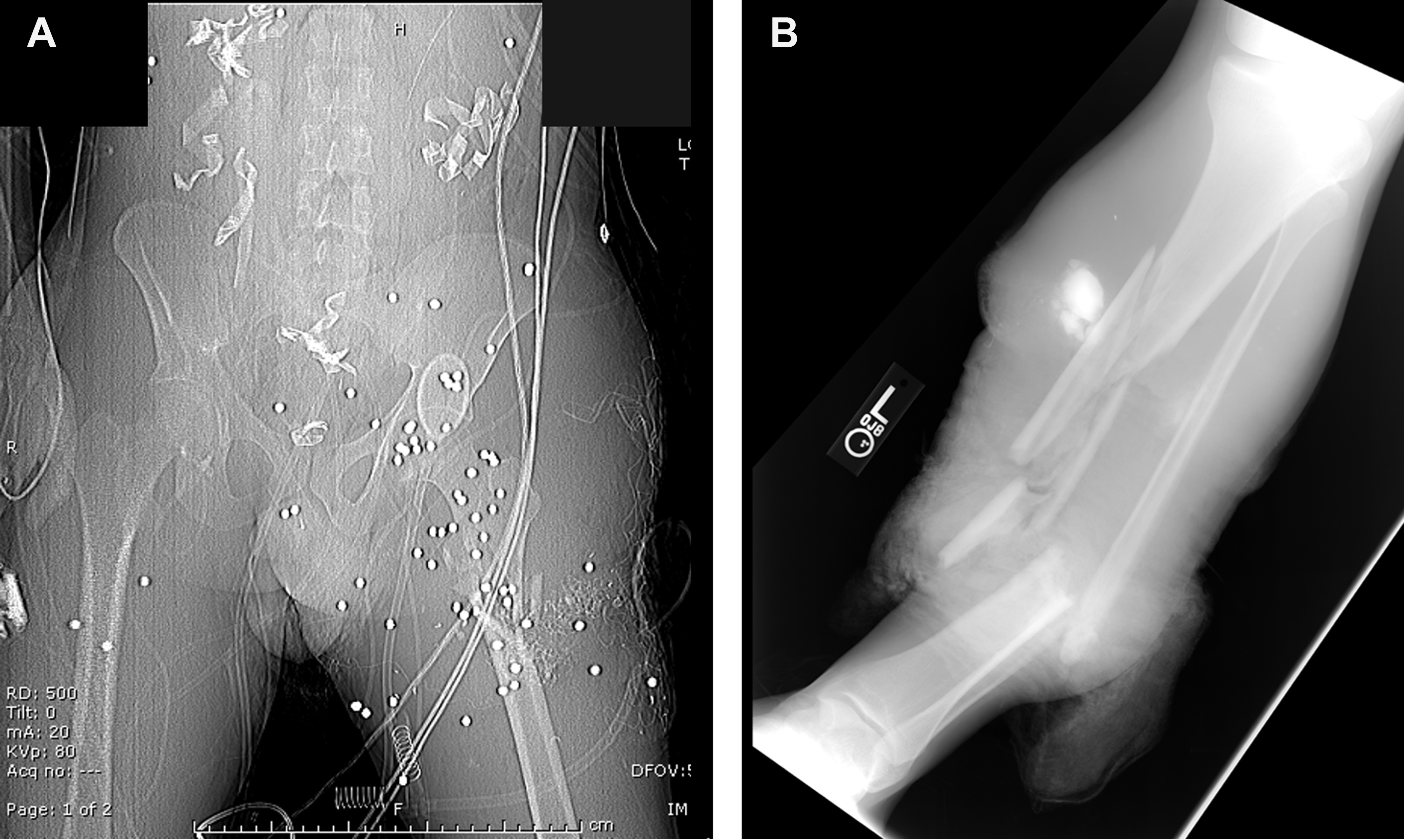 Once the patient is stabilized, a thorough secondary survey, including comprehensive physical lower extremity examination, should document any soft tissue losses, identify any non–life-threatening vascular injury(-ies), associated nerve injury(-ies), muscle-tendon deficits, and concomitant bony injury(-ies). Initial radiographs to determine the extent of bony injury using a portable radiograph once in the military trauma bay because orthopedic injury should heighten the suspicion for neurovascular injury. These studies should not interfere, however, with a more diagnostic computed tomography (CT) with or without angiography scan when indicated. These studies can provide more robust examination of soft tissue defects and vascular integrity when combined with a lower extremity angiogram.