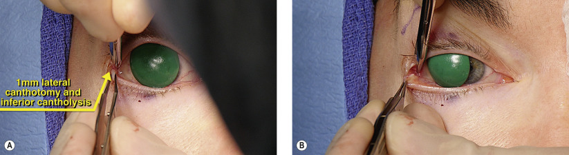 | Assess adequacy of anterior lamella; may need cheek lift or skin graft if severe shortening |