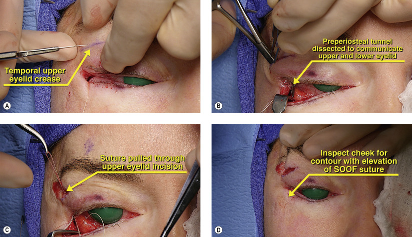 Conceptually, this chapter and the following two ( Chapters 35 and 36 ) are fundamentally similar. The surgery is performed through a transconjunctival approach. The lower eyelid cicatrix is released with an optional subperiosteal midface lift. Orbitomalar suspension can be performed to elevate the midface and to recruit additional anterior lamella. The spacer graft is secured posteriorly and the lower eyelid is tightened. The lower eyelid is then immobilized with Frost sutures.