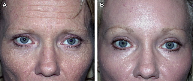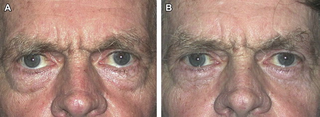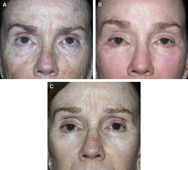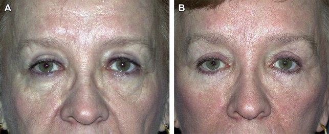 The most frequent approach used is transconjunctival because it maintains the integrity of the orbicularis muscle, gives equal exposure to the to the fat pads as do the external techniques, and allows for a skin pinch and/or laser resurfacing to correct the dermatochalasis. If the skin excess can be eliminated by a pinch excision alone, carbon dioxide (CO 2 ) or erbium laser resurfacing is not used. If fine rhytids are present, or if skin excess is minimal, laser resurfacing alone is performed ( Fig. 4 ). Skin excess and fine rhytids are treated with both skin pinch and laser resurfacing. This approach is also effective in patients who have very mild lid laxity because a canthoplasty can be avoided because the main supporting structures of the lid are maintained.