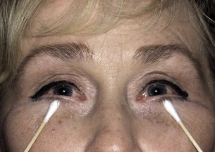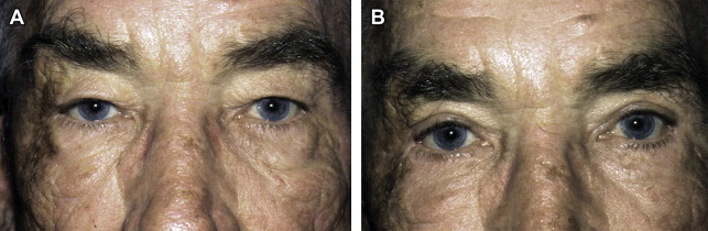 Immobility of the lower eyelid following a transconjunctival approach with fat repositioning: The lower lid should be able to be elevated to the superior limbus; but at times, there is restriction of the lid on the upward gaze. This effect almost always resolves with time and massage, but rarely triamcinolone 5 mg/mL injected into the middle lamella is needed. I have not seen a permanent problem with this ( Fig. 2 ).