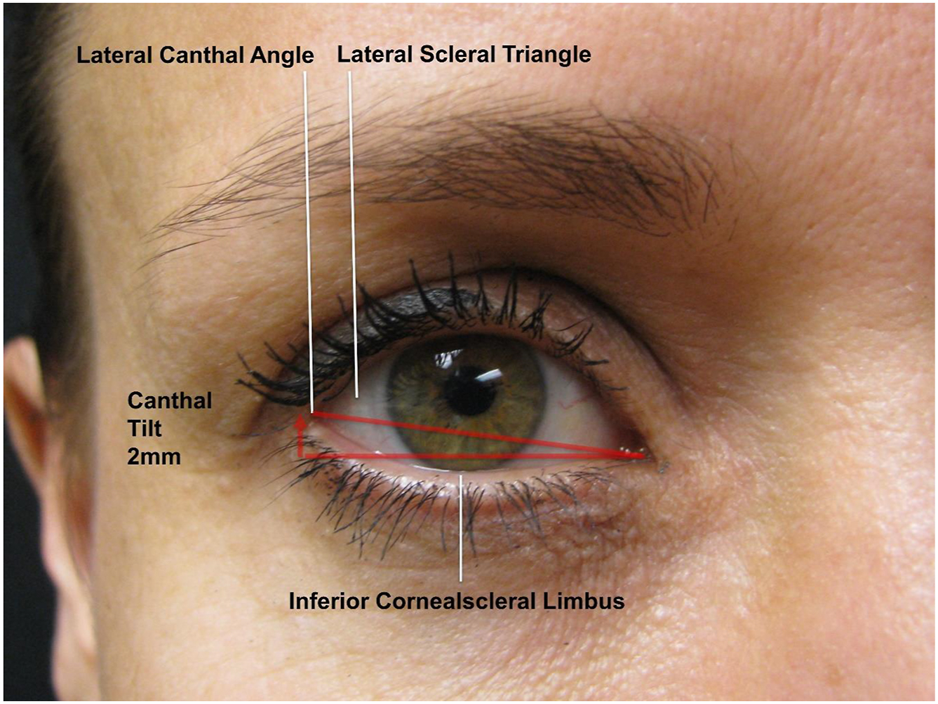 Surface Anatomy and Descriptors of Lateral Canthal and Lower Lid Position. The photograph illustrates common descriptive terms in reference to the lower eyelid. Appropriate canthal tilt in relation to lower eyelid position is illustrated. The lower eyelid should ideally be positioned 1 to 2 mm above the inferior cornealscleral limbus.