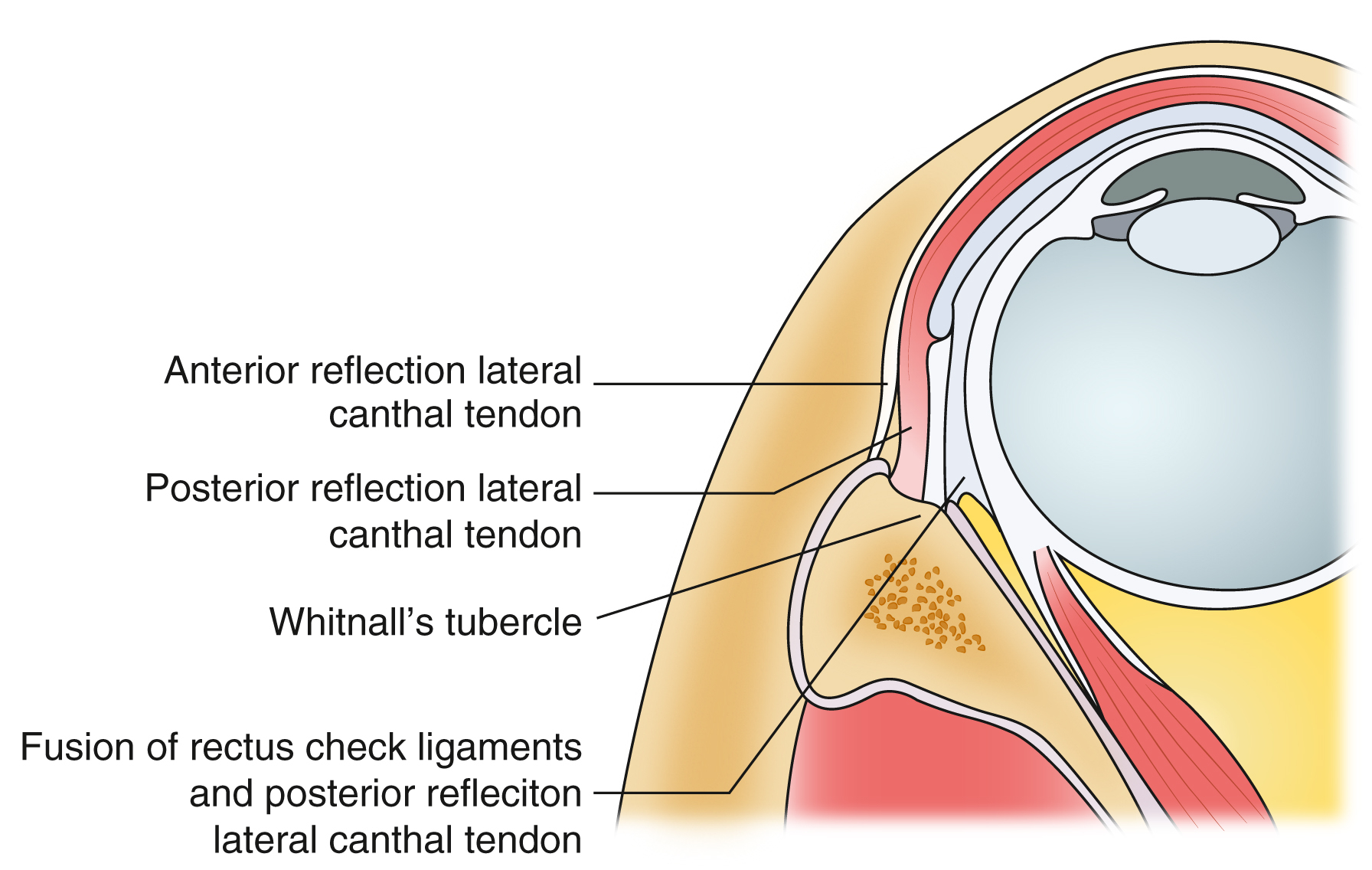 The Lateral Canthal Mechanism. The lateral canthal tendon has 2 divisions. The anterior reflection inserts on the anterior-most projection of the orbital rim. The posterior reflection inserts onto Whitnall’s tubercle and has a continuum to the lateral rectus check ligaments attaching to the lateral rectus muscle. This allows the tarsal plate to remain tangent to the globe. Failure to re-suspend the lateral canthus along this vector can lead to disruption of the globe and lid interface.