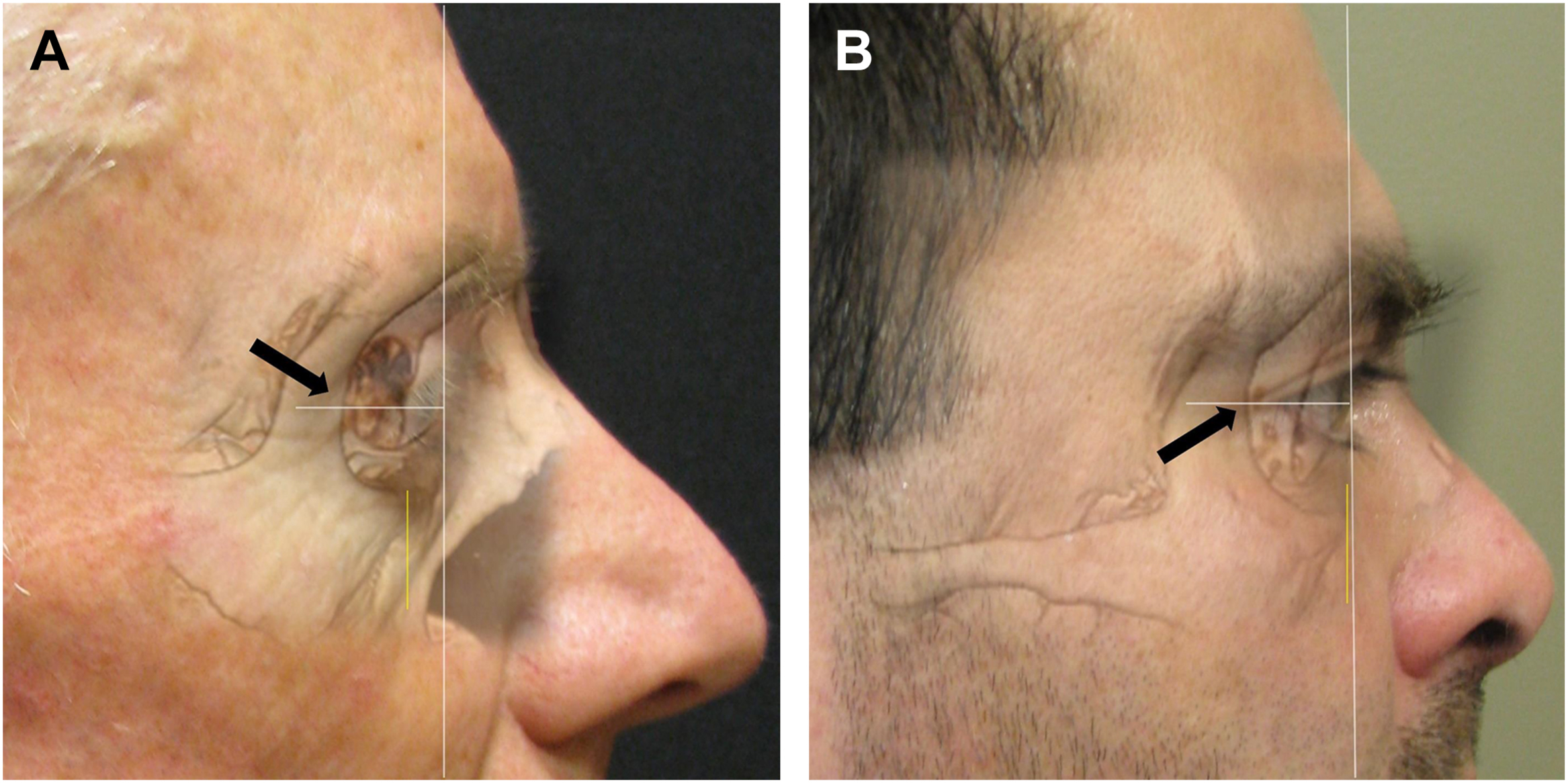 Lateral Canthal Dystopia with Inadequate Fixation. Canthal fixation must be placed in an appropriately placed vector which follows the posterior reflection of the lateral canthal tendon toward Whitnall’s tubercle. It is a common error for inexperienced surgeons to place canthal fixation sutures too superficial on the anterior orbital rim ( A , patient’s left side ). This leads to widening of the lateral canthal angle and a larger lateral scleral triangle. The dystopia of the lid and its approximation to the globe is aesthetically displeasing and leads to potential for asymmetry ( B , patient’s left side ). Appropriate vectors for canthal fixation are illustrated on the patient’s right side of A and B.