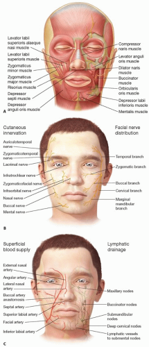 FIG 1 • A. Musculature of the face. B. Motor and sensory innervation of the face. C. Blood supply and lymphatic drainage of the face. The nasolabial flap is a random pattern flap and does not need a perforating blood vessel to be found for viability of the flap.2