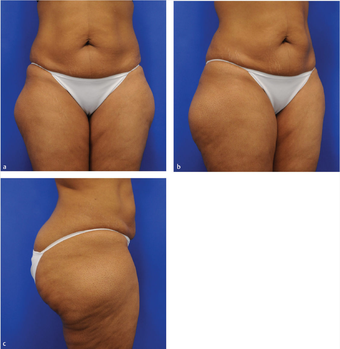 Skin redundancy and residual adiposity noted on the central trunk.