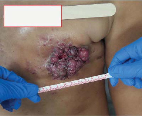 Compared to females, males may present at more advanced stages of disease. Multiple factors may play a role in this later presentation ranging from less routine screening to a possible lack of awareness of male breast cancer by both patients and providers. Figure 19-1 demonstrates a locally advanced male breast cancer at presentation. A SEER review by Leon-Ferre compared stage at presentation between male and female breast cancer demonstrated more advanced stages in male patients (6). Stage 2 (43% vs. 28%), stage 3 (8% vs. 5%), and stage 4 (3% vs. 2%) disease were all more common in male patients with breast cancer.