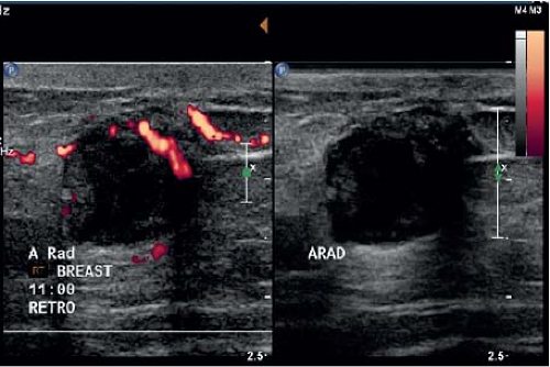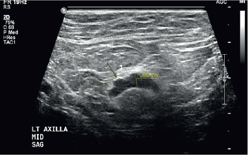 In the male breast, the majority of malignancies are subareolar and metastasis to the axilla is common. It has been reported that 50% of men have axillary nodal metastasis at initial presentation (9). US of the ipsilateral axilla should be included. It is important to note the morphology of the nodes matters more than the overall size. Displacement of the fatty hilum, increased cortical thickness >3 mm or irregular contour of the cortex are suspicious findings and warrant tissue sampling (Fig. 19-5). If US-guided axillary lymph node biopsy reveals metastatic disease, then additional staging examinations similar to what female breast cancer patients undergo are indicated. Computed tomography (CT) of the thorax and abdomen and Tc99m-HDP whole-body bone scan are recommended.