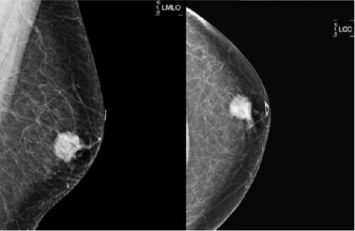 If the appearance is classic “flame shaped” on mammogram and there is NO evidence of a mass, then US should be avoided as this will usually lead to an unnecessary biopsy. US is indicated if the mammogram demonstrates a visible mass or the palpable breast mass is located away from the nipple (Fig. 19-3). Figure 19-4 demonstrates a left subareolar mass with convex borders and coarse calcifications on mammography. Calcifications seen on mammography deserve workup in the male breast. Magnification views should be performed to determine extent and