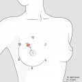 Examination for gynaecomastia. Physical examination method to distinguish gynaecomastia, due to enlargement of the glandular tissue, from pseudo-gynaecomastia, due to excessive adipose tissue. The thumb and forefinger are placed on opposite sides of the enlarged breast and slowly brought together towards the areolar-nipple complex. Gynaecomastia is appreciated as a concentric, rubbery-to-firm disc of tissue, often mobile, located directly beneath the areolar area. Pseudo-gynaecomastia presents no discrete mass. Note that other masses due to disorders such as cancer tend to be eccentrically positioned (insert)
