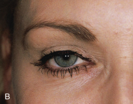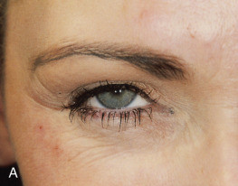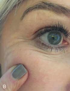 Examine the tone of the orbicularis oculi muscle and the position of rhytids. Are the wrinkles deep? Spread the skin gently between your fingers. Are they still very obvious? If they are, tell patients that they might not notice much effect from the treatment. Advise them about laser resurfacing and skin management. If the wrinkles are mild, advise patients that they might get a permanent effect with time and good skin care ( Fig. 8.2 A and B).