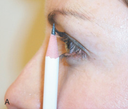 Examine the contour of the socket. Is it shallow, allowing anterior displacement of orbital fat and bags? Does the inferior orbital rim protrude? Is it recessed behind the level of the anterior surface of the cornea? This may also be assessed by the ‘pencil test’. Ask the patient to hold a pencil vertically against the anterior cheekbone. If this passes in front of the cornea ( Fig. 8.4 A), then the patient has good lower lid skeletal support. If the pencil reaches only the lash margin (see Fig. 8.4 B), before it would penetrate the globe, then the patient is at risk of developing sagging of the lower lid and widening of the palpebral aperture if botulinum toxin is injected for pretarsal orbicularis wrinkles.