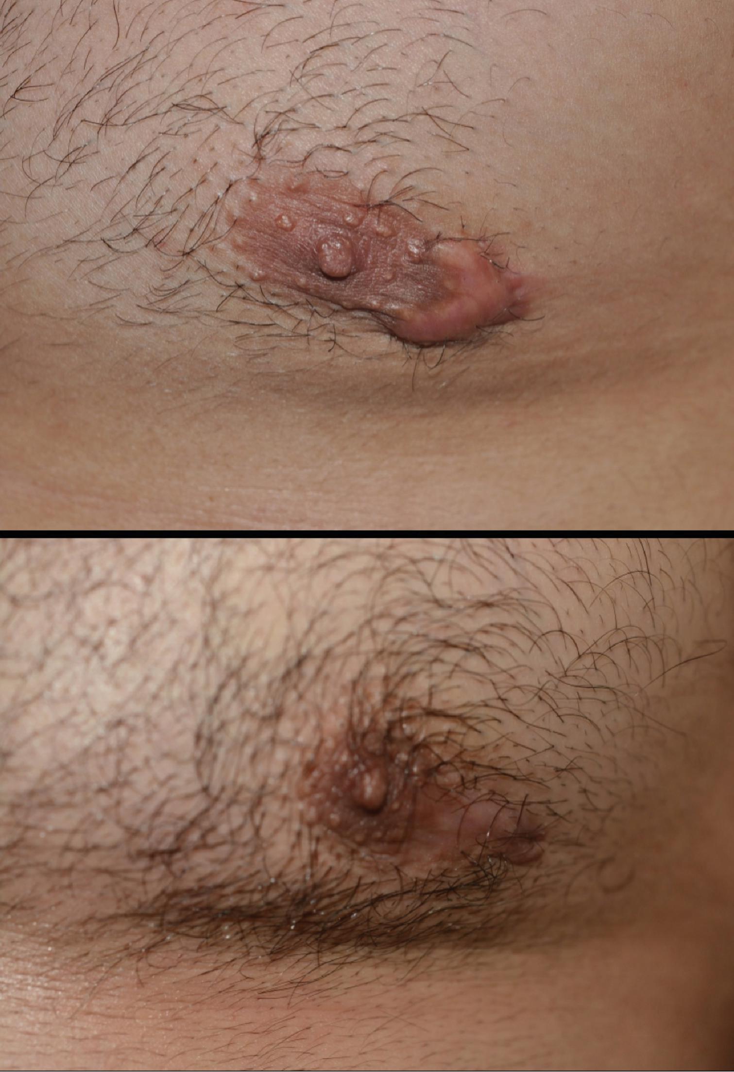 Treatment via laser and compression therapy. A 35-year-old male patient received seven combination treatments with pulsed dye laser, nonablative and ablative laser, Kenalog 10, Kenalog 20, and 5-FU. In between treatments compression was utilized to achieve optimal results.