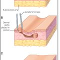 Scarring must be understood where it begins—at the cellular and molecular level. Wound healing is a multistep process with overlapping phases. The phases are classified as inflammatory, proliferative, and remodeling. The inflammatory phase starts immediately after injury and completes within the first 48 to 72 hours. It begins with activation of the clotting cascade resulting in release of cytokines IL-6 and IL-8 and several chemokines. Immune cells arrive to the site of injury and local cells proliferate. Release of TGF-β results in fibroblast recruitment, thus starting the proliferative phase. This phase can last up to 7 weeks following injury. Granulation tissue begins to form and is made up of macrophages, fibroblasts, proteoglycans, hyaluronic acid, elastin, and procollagen. Ongoing signaling by TGF-β, released by macrophages, activates fibroblasts and induces collagen III formation. Myofibroblasts start the process of wound contraction. The proliferative phase also initiates angiogenesis, and the wound begins to reepithelialize as keratinocytes from the wound periphery migrate across the wound surface. The remodeling phase is characterized by wound maturation and completes in 1 year. Normal extracellular matrix remodeling of the scar takes several months. Initially the extracellular matrix is composed of fibrin and fibronectin. About 2 to 3 weeks after injury, stress on the wound stimulates deposition of collagen type III. Matrix metalloproteinase deposition is a rate-­limiting step in collagen remodeling. There is a delicate balance between destruction of immature and formation of mature wound structures. Over time, collagen type III is replaced by collagen type I, forming stronger scar tissue. This type I collagen is arranged in bundles parallel to the epidermis, in nonpathologic scar formation. Immature blood vessels formed during proliferation regress. Fibroblasts also play an important role in scarring. The deeper reticular fibroblasts have a specific phenotype and produce more TGF-β3, connective tissue growth factor, and heat shock protein 47. Scarring only occurs after a threshold of dermal injury and activation of fibrotic fibroblasts. Langerhans cells are found in greater numbers in hypertrophic scars and recruit T cells. Keratinocytes of hypertrophic scars have a higher proliferative index with increased Ki67, K5/14 expression, and aberrant expression of hyperproliferative keratin K6 and K16.