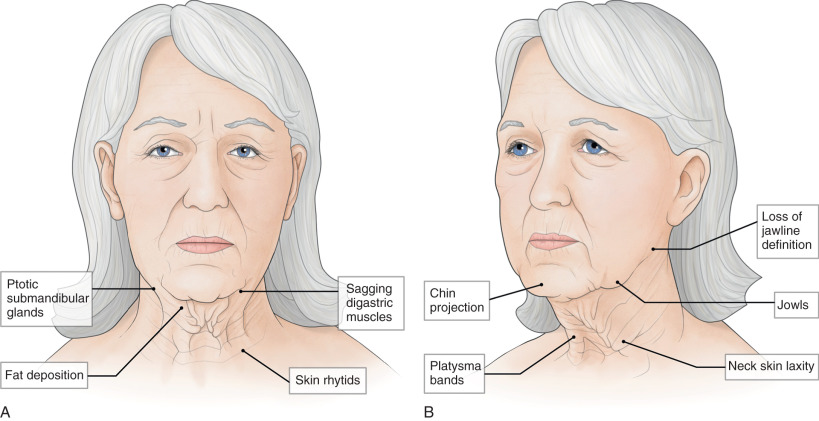 The shape and form of the neck can be altered by various maneuvers that reposition, modify, and remove certain key components. The level of invasiveness increases with the depth of the modification. Altering superficial components of the neck, such as the skin and subcutaneous fat, is less invasive and risky than surgical modification of deeper structures, such as the submandibular glands. In patients with the early signs of aging that have affected skin tone and texture, options of using laser or energy-based technologies are available to tighten and tone the skin. If patients are complaining of excess skin that is significant, a skin excision is indicated to remove excess skin folds that make the person appear old. This requires incisions around the ear that leave scars. With skin excision, there is an increased risk of wound healing problems. The risk-benefit ratio is acceptable in this group because current technology will not tighten redundant skin.