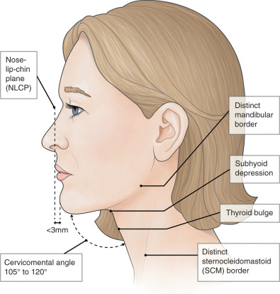 Cervicomental angle, 105 to 120 degrees; submental-sternocleidomastoid angle, 90 degrees