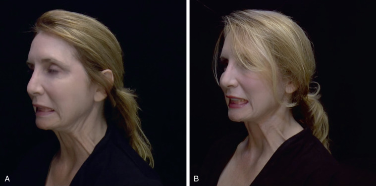 In most cases, subcutaneous fat deposits are present that add to the loss of refined contours of the neck. It is important to localize the fat deposits preoperatively so that fat removal can be performed accurately. This can be determined by observing the patient as he or she flexes the neck musculature and platysma muscle ( Fig. 12.3 ).