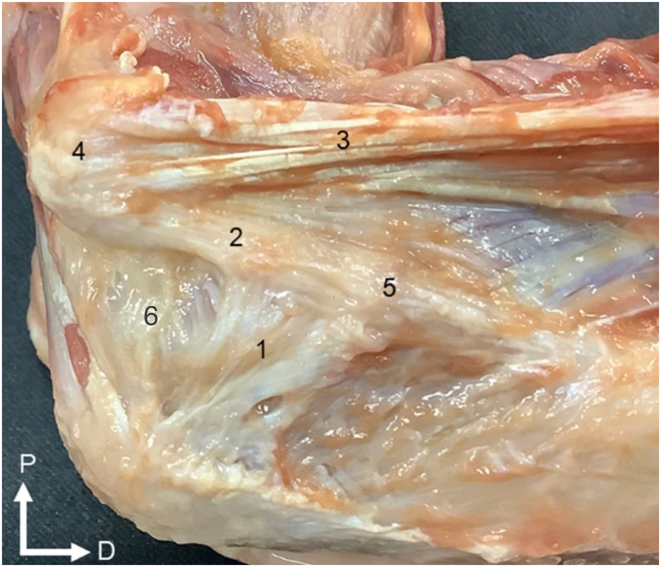 Dynamic stabilizers of the medial elbow primarily consist of the flexor carpi ulnaris (FCU), flexor digitorum superficialis (FDS), and pronator teres (PT), which comprise of the FP tendinous complex. The FCU is the primary dynamic stabilizer, the FDS is a secondary stabilizer, and the PT contributes the least. The FCU originates proximally at the common flexor insertion and distally along the ulnar ridge, while the FDS overlaps with the UCL insertion, providing significant restraint against valgus stress. Recent literature underscores the pivotal role of dynamic stabilizers, notably the FCU and FDS, in countering valgus stress. Lin and colleagues demonstrated that the FCU and FDS provided the most stability between 45 and 90°. Furthermore, electromyography studies have shown increased activation of the FCU during the throwing motion. Anatomic studies have demonstrated the intimate relationship between the tendinous complex, joint capsule, and the UCL, essentially forming a confluence of structures over the medial elbow, underscoring the clinical importance of strengthening these muscles during rehabilitation. ( Fig. 2 )