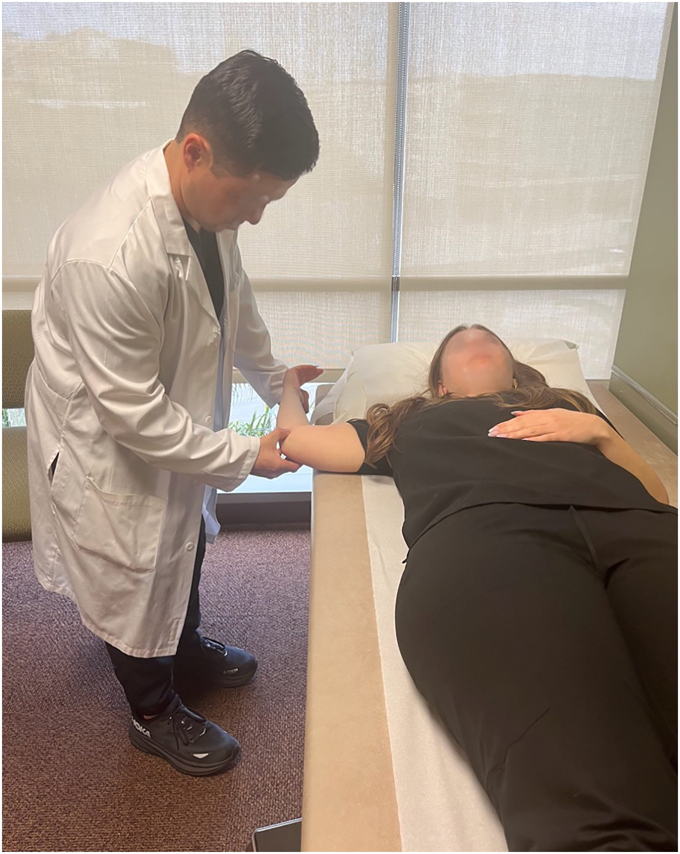 On examination, key landmarks to palpate include the medial epicondyle, UCL, sublime tubercle, FP, ulnar nerve, and olecranon. Both passive and active range of motion of the elbow should be evaluated, specifically for full extension and the presence of posterior pain with terminal extension as this is associated with posteromedial impingement. The shoulder should be assessed for range of motion (ROM) deficits compared with the contralateral shoulder and for scapular dyskinesis. A neurovascular assessment should include sensory and motor testing of the ulnar nerve, Tinel’s sign, ulnar nerve compression test, and stability of the ulnar nerve with elbow ROM. The presence of a palmaris longus should also be noted. Special maneuvers to evaluate the integrity of the UCL include the milking maneuver and moving valgus stress test. The milking maneuver test is performed by placing the shoulder at 90° of abduction, the elbow at 90° with the forearm in full supination followed by pulling on the thumb to create a valgus force. The moving valgus stress test is performed in the same position as the milking maneuver while flexing and extending the elbow ( Fig. 2 ). Pain or apprehension between 70 and 120° of flexion is considered a positive test. Flexion and extension outside of this range will engage the coronoid and olecranon, respectively, and provide stability, resulting in a reduction of symptoms. Prior studies have demonstrated a sensitivity of 100% and specificity of 75% with the moving valgus stress test. Additional tests to evaluate for a FP strain include resisted forearm pronation with the elbow extended and temple pressure with the thumb, index, and middle finger.