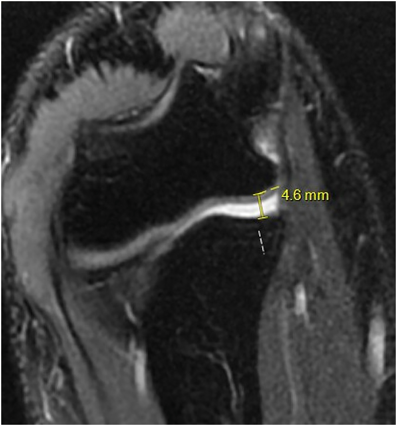 Conventional 3 Tesla (3T) MRI and MR Arthrograms (MRA) are the study of choice for diagnosing UCL injuries. MRA has slightly better diagnostic accuracy than conventional 3T MRI. MRA is 100% sensitive and specific and 3T MRI is 100% sensitive and 89% specific for detecting full-thickness UCL tears. The improved diagnostic capabilities should be weighed against the invasiveness, added patient discomfort, and increased cost. A flexed elbow valgus external rotation (FEVER) MRI view was recently described as a dynamic assessment of the competency of the UCL that may improve diagnostic accuracy. A FEVER view is obtained using a 30° coronal oblique MRI view to be parallel with the long axis of the UCL while placing the elbow at 90° with valgus stress applied and subsequent measurement of the ulnohumeral gapping from the subchondral edges ( Fig. 3 ); computed tomography scan is reserved for surgical planning, particularly revision cases to assess the amount of tunnel widening or bone loss, as well as for large posteromedial osteophytes.