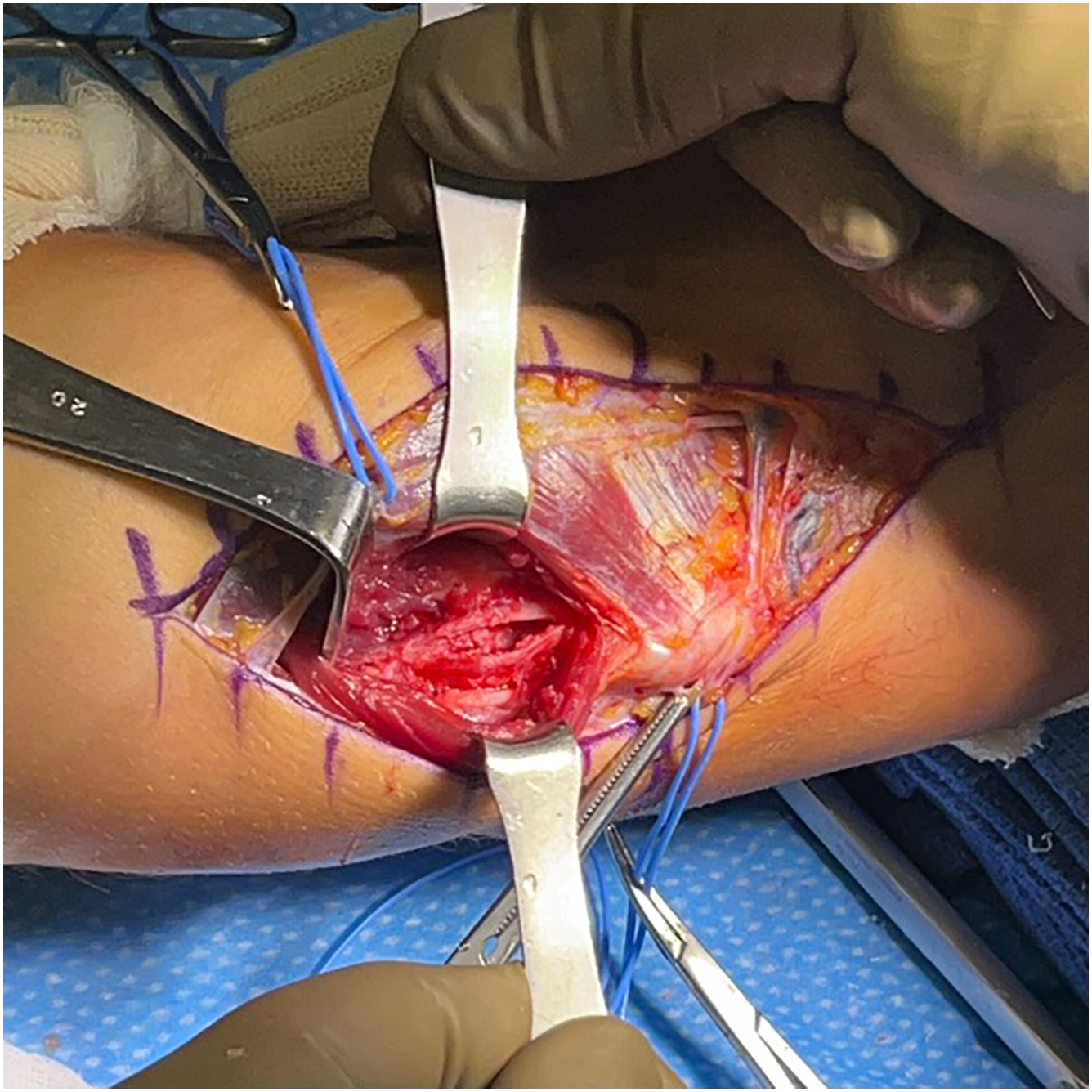 The patient is placed supine with the arm on a hand table. After administration of general anesthesia, a nonsterile tourniquet is applied. A curvilinear skin incision is made centered over the medial epicondyle. Subcutaneous dissection is carried down to the fascia taking care to preserve the medial antebrachial cutaneous nerve. A periosteal elevator is used to expose the anterosuperior surface of the supracondylar ridge to prepare for the exiting humeral bone tunnels. A muscle-splitting approach is performed by making a longitudinal incision over the tendinous raphe of the FCU. The underlying ligament is exposed with a periosteal elevator and a longitudinal split is made in the anterior bundle of the UCL ( Fig. 4 ).