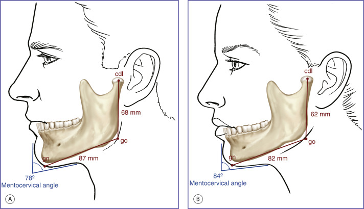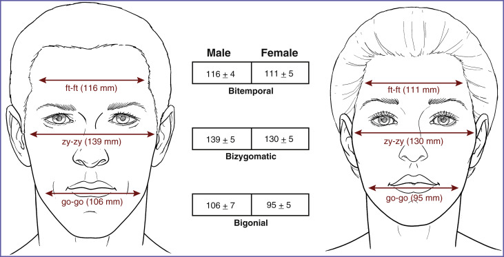 Mandibular body and ramus augmentation in women with normal-dimensioned mandibles should be conservative with the intention of providing definition. The anthropometric measurements provided by Farkas ( Fig. 12.1 ) help in understanding our visual interpretation of male and female patients with normal mandibular morphology and dimensions who undergo mandibular augmentation. These data show that all transverse facial dimensions are greater in men than in women and that the bigonial distance is the transverse facial dimension that has the greatest difference between sexes. In other words, the lower third of women’s faces tends to be absolutely and relatively narrower than that of men. Hence, when normal male mandibles undergo augmentation, they may be perceived as stronger. However, when normal female mandibles undergo aggressive augmentation, they may be perceived as less feminine.