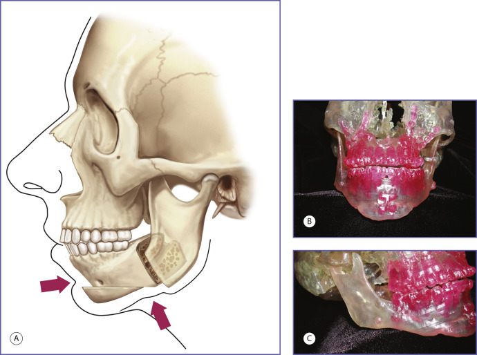 A third group of patients who may benefit from alloplastic augmentation of the mandible are patients who have had their class II dental malocclusion due to mandibular deficiency corrected by sagittal split osteotomy with advancement of the distal segment. This procedure splits or separates the tooth-bearing symphysis and adjacent bodies from the non-tooth-bearing but articulating rami. Requisites for positioning the resultant anterior and posterior segments to improve occlusion, allow bone healing, and continue joint function may result in a displeasing postoperative contour. The advancement of the distal, or tooth-bearing, segment is dictated by occlusal relations. It inevitably creates a contour irregularity at the site of the body osteotomy and distal segment advancement. This area of narrowing may be visible, and even disfiguring, in certain individuals. Positioning of the posterior segment requires that the condyle be seated in the glenoid fossa and that there be sufficient segment contact to allow bone healing. Fulfillment of these requisites dictates the position of the ramus and its angle. This may result in an aesthetically displeasing position of the ramus angle with insufficient height, insufficient width, or asymmetry ( Fig. 12.4 ). Mandible implants can be used to improve contour in these patients. Computer-aided design and manufacture (CAD/CAM) implant augmentation has proven to be a more precise method to treat the contour irregularities and asymmetries in this group of patients. The use of CAD/CAM implants is presented in Chapter14, Chapter15 .